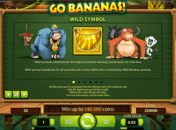 Популярный в сети Интернет официальный игровой клуб предлагает любителям азарта отправиться в тропические джунгли. Запустив в режиме онлайн игровой автомат Go Bananas!, геймер получит отличную возможность побывать в дивных местах с необычными обитателями. Главные роли производитель игровых симуляторов решил отдать веселым обезьянам, которые благодаря своим симпатичным мордашкам обеспечат игрокам отличное настроение на всю трудовую неделю.