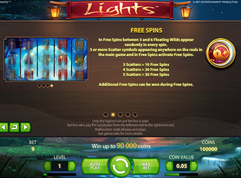 Бренд Netent, который регулярно радует своих поклонников увлекательными азартными играми, выпустил необычный слот. Игровой автомат Lights с фантастически оформленным геймплеем затрагивает тему любви жителей Поднебесной Империи к разного рода фонарикам. Главная отличительная черта игры Фонарики – Вайлд, который здесь выпадает практически в каждом спине и способствует образованию комбинаций.